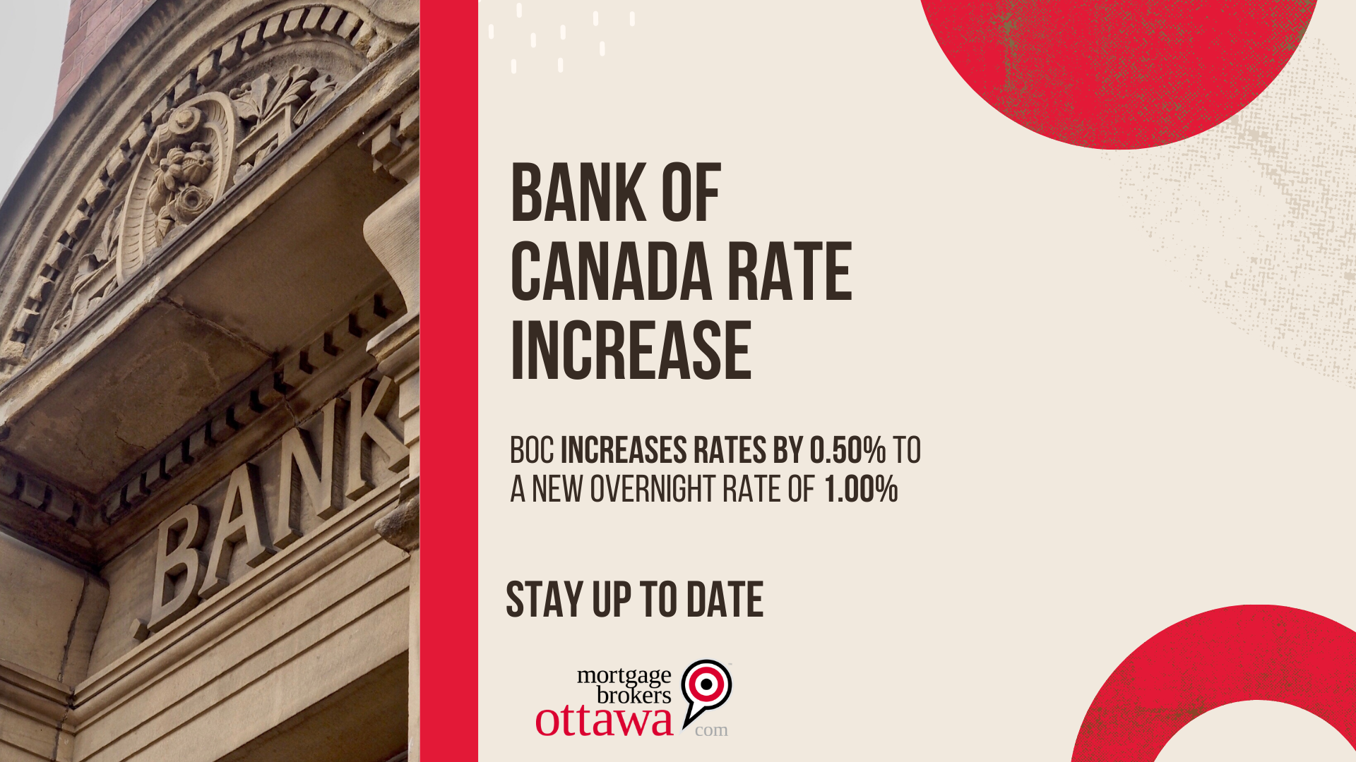 The Bank of Canada raises key interest rate by 0.50 per cent to a new overnight rate of 1.00 per cent